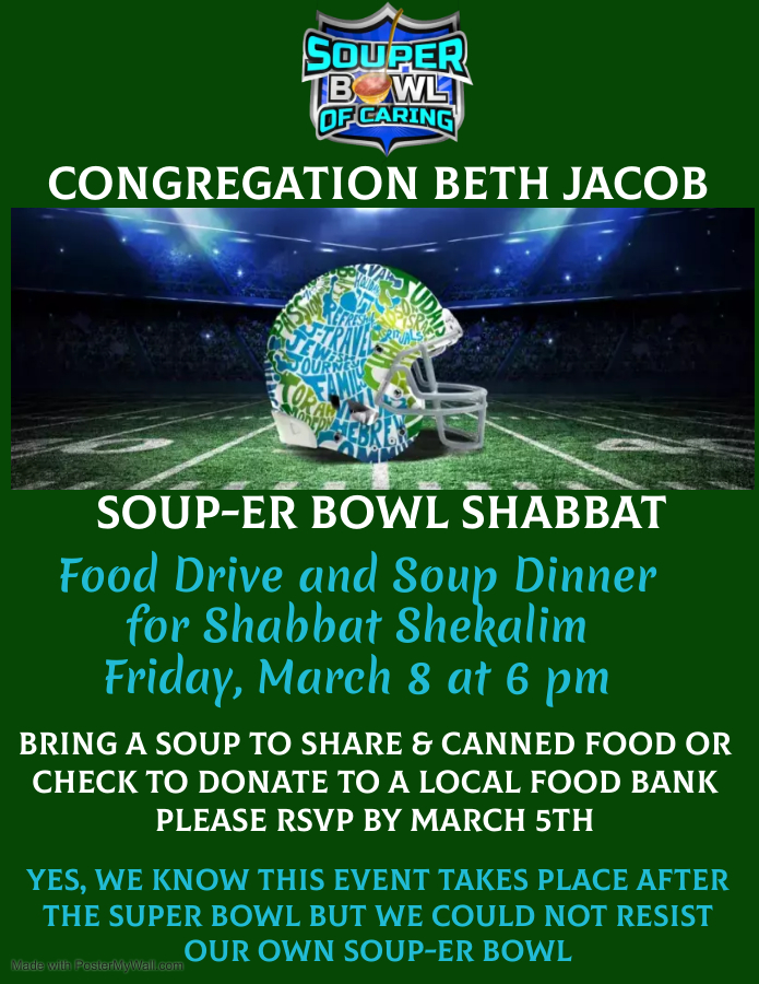 Please join us in person, for the soup, the service, and for an Oneg following the service. If you can’t be there, you can view the service remotely using Zoom.